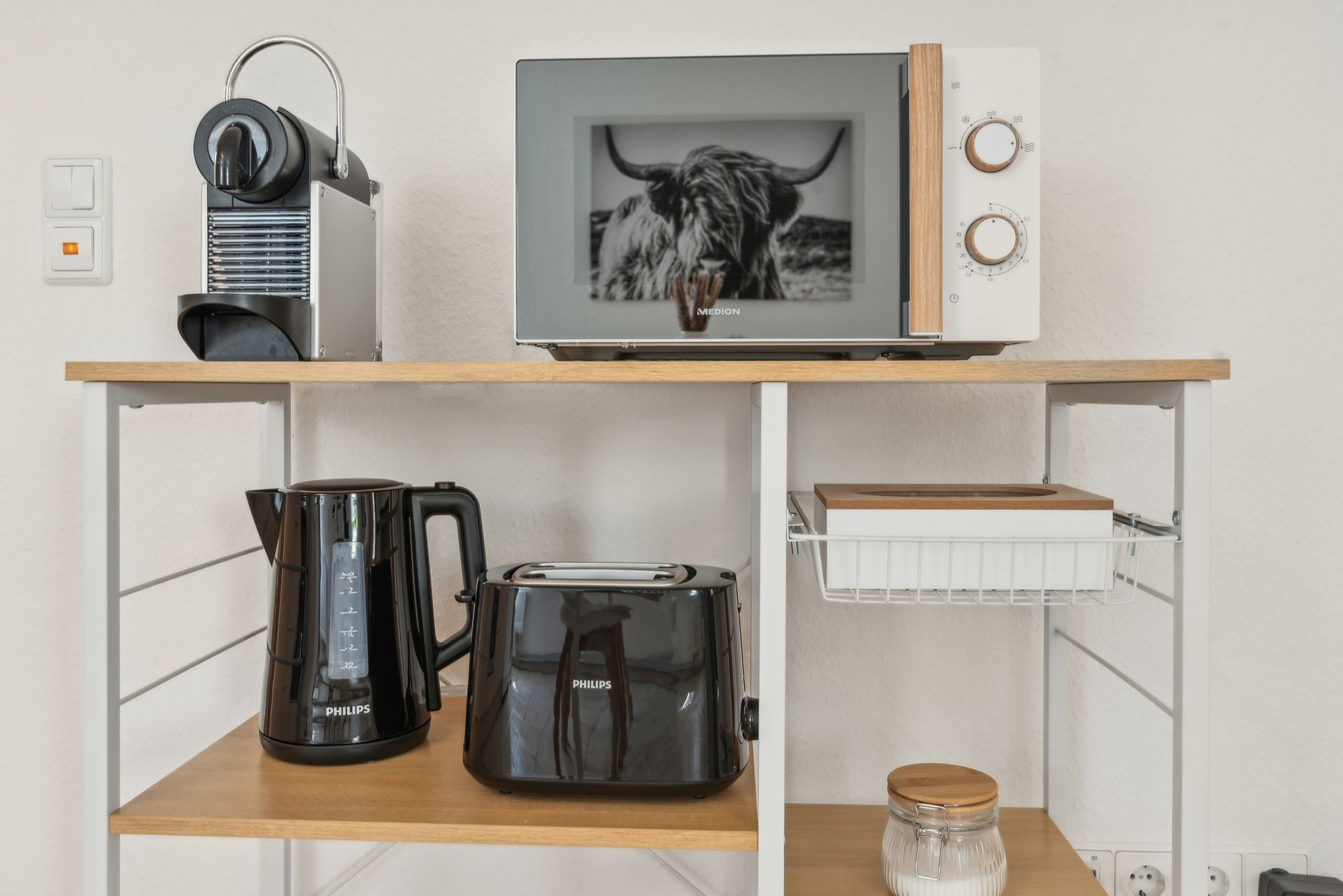 • Wohn- und Essbereich: Ein heller, einladender Raum mit Smart-TV und einer ausziehbaren Schlafcouch (140 cm breit). Der Essbereich bietet Platz für vier Personen an einem gemütlichen Tisch. Die voll ausgestattete Küche lässt keine Wünsche offen -  inklusive gratis Tee und Kaffee.