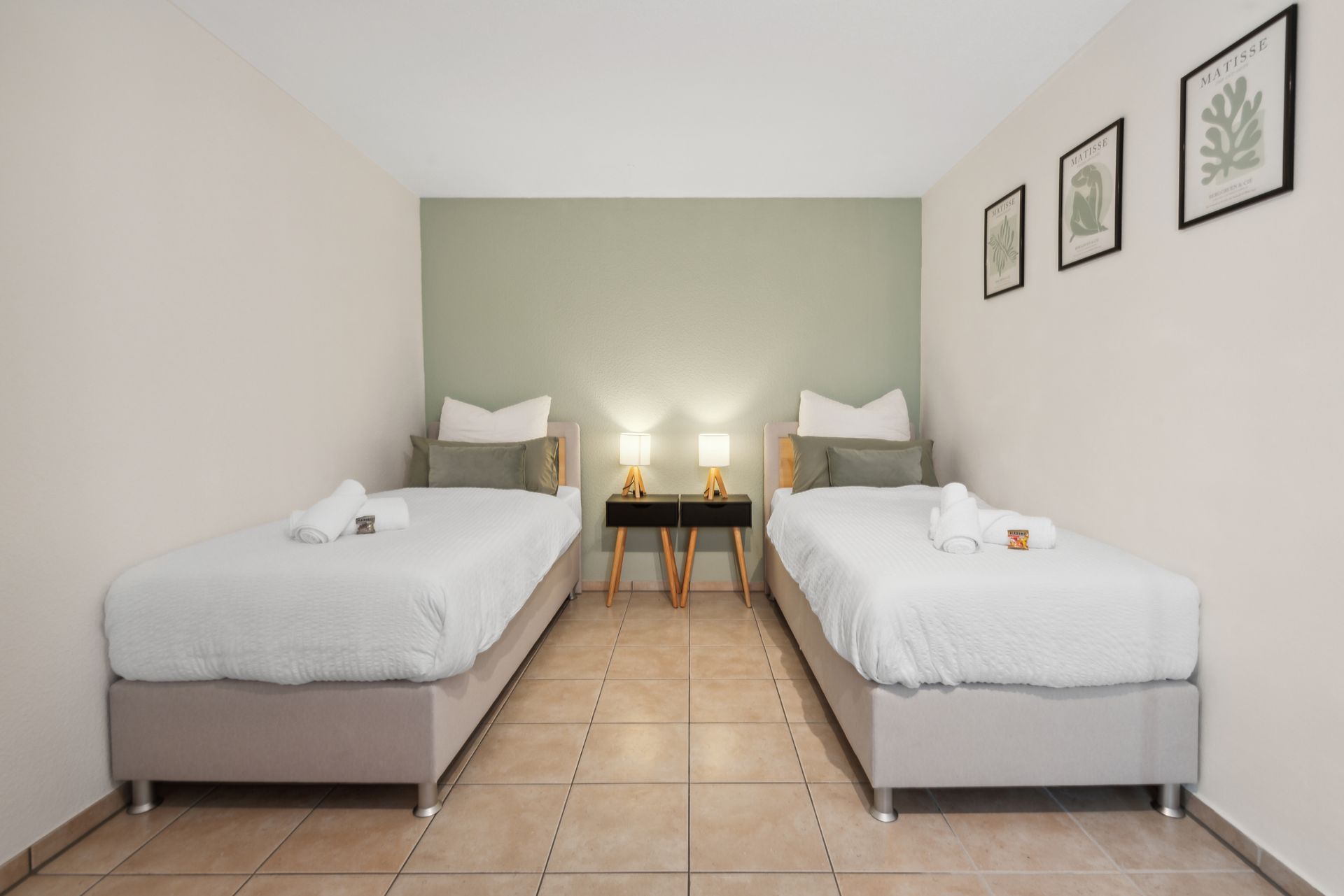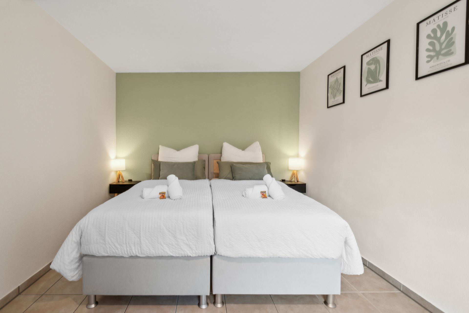 • Schlafzimmer: Zwei bequeme Einzelbetten in Hotelqualität, die sich zu einem Doppelbett kombinieren lassen, sorgen für erholsamen Schlaf. Hochwertige Musselin-Bettwäsche und ein geräumiger Kleiderschrank runden den Komfort ab.